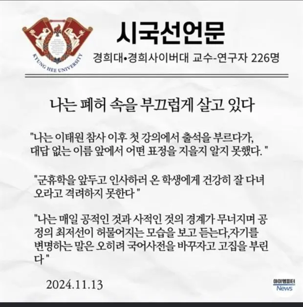 경희대 교수들의 선언문은 그 메시지의 강렬함과 비판적 시각으로 많은 이들의 주목을 받았습니다. 그들은 사회적 모순과 그로 인한 개인의 무력감을 진솔하게 드러내면서, 학생들과 국민들이 이 현실을 직시하고 변화를 만들어나가기를 촉구하고 있습니다.